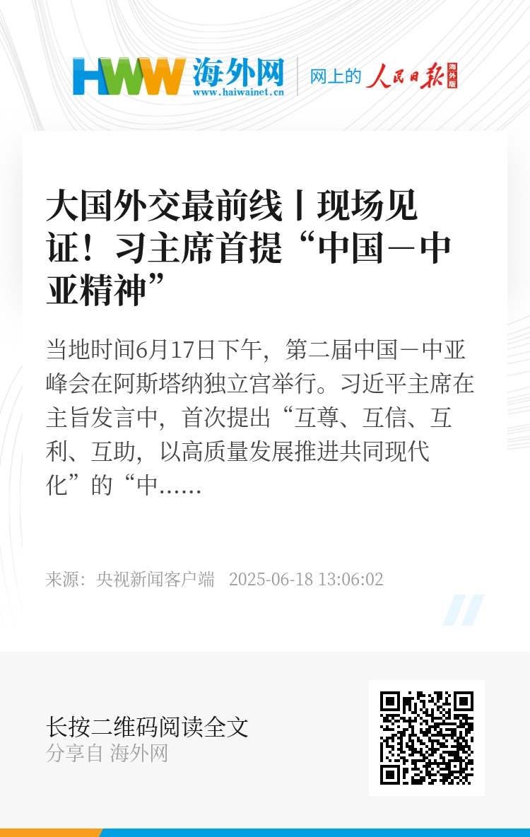 当地时间6月17日下午,第二届中国-中亚峰会在阿斯塔纳独立宫举行。习近平主席在主旨发言中,首次提出“互尊、互信、互利、互助,以高质量发展推进共同现代化”的“中国-中亚精神”,为世代友好合作提供了重要遵循。
