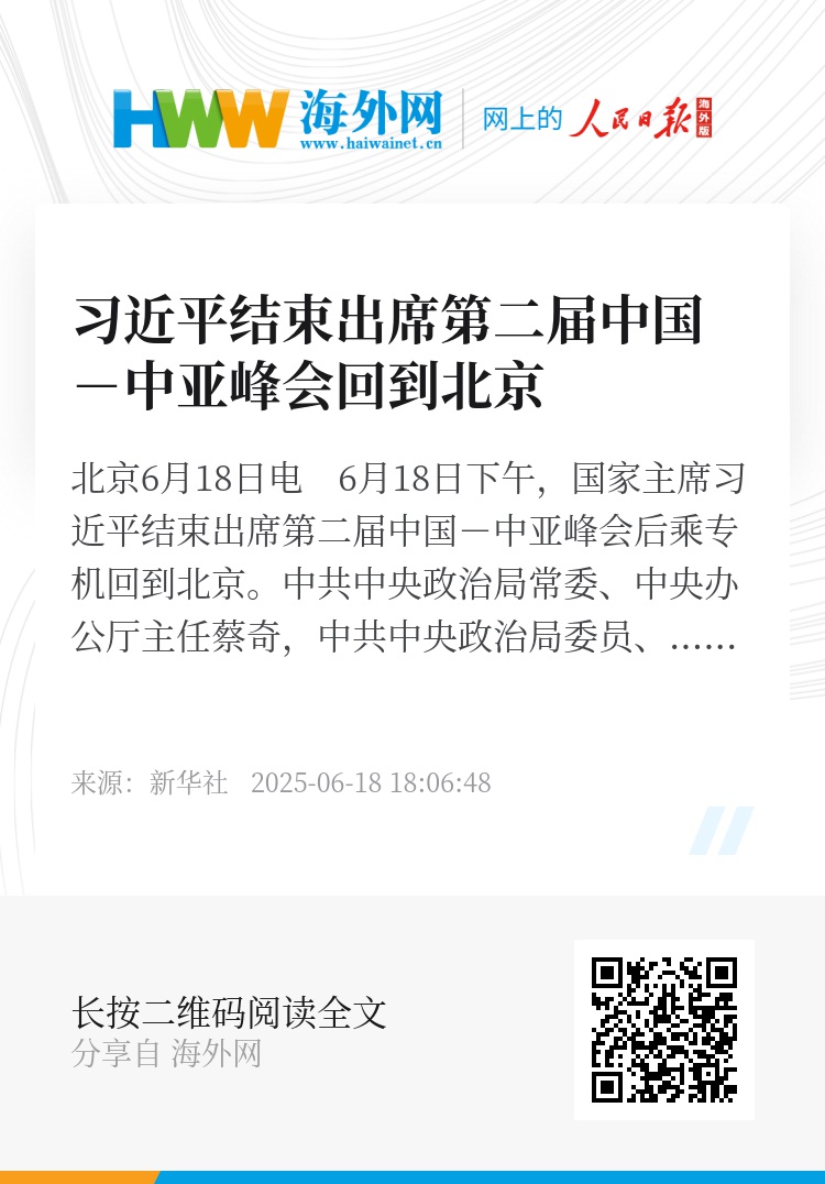 新华社北京6月18日电 6月18日下午,国家主席习近平结束出席第二届中国-中亚峰会后乘专机回到北京。