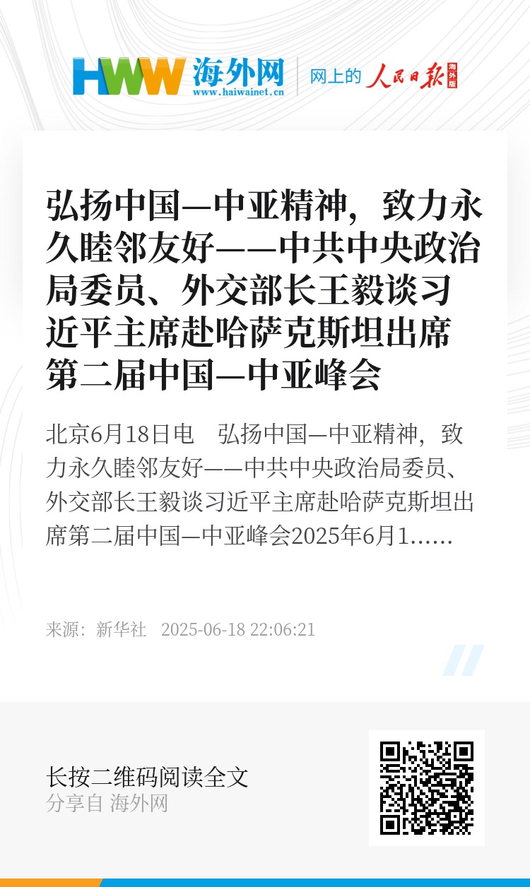 新华社北京6月18日电 弘扬中国—中亚精神,致力永久睦邻友好——中共中央政治局委员、外交部长王毅谈习近平主席赴哈萨克斯坦出席第二届中国—中亚峰会