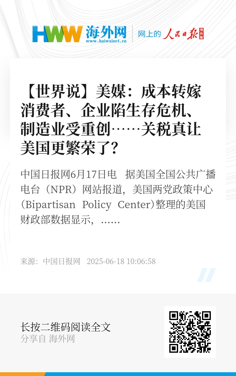 报道称,特朗普政府对外加征的关税能否让美国人更富裕还是个未知数,但人们已知的是,关税的代价主要由美国企业和家庭承担。来自俄亥俄州的红酒进口商帕特里克·艾伦(Patrick Allen)批评说:“这是对原材料进口企业或者像我这样经销进口葡萄酒的人征收的税。最终,这会转嫁到所有购买商品的消费者身上。”