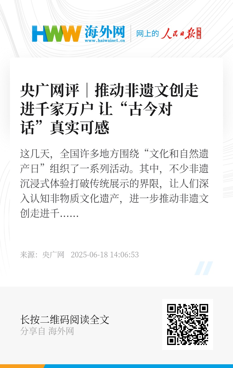 非物质文化遗产需要以使命感和责任感去呵护。我们期待,社会各界能够形成更强合力,让更多非遗技艺在数字时代焕发新生,为坚定文化自信、建设文化强国贡献更加强劲的力量。(央广网评论员 文峰)