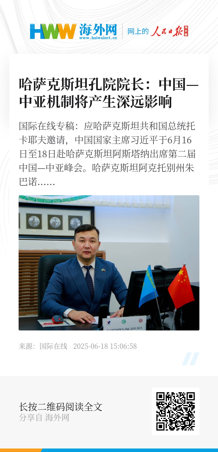 国际在线专稿:应哈萨克斯坦共和国总统托卡耶夫邀请,中国国家主席习近平于6月16日至18日赴哈萨克斯坦阿斯塔纳出席第二届中国—中亚峰会。哈萨克斯坦阿克托别州朱巴诺夫大学孔子学院哈方院长克恩托列吾乐·达吾列提(KANTOREULY DAULET)接受国际在线记者专访时表示,此次峰会为深化哈中传统友谊、拓展务实合作提供了战略机遇,将对地区安全稳定与经济繁荣产生深远影响。