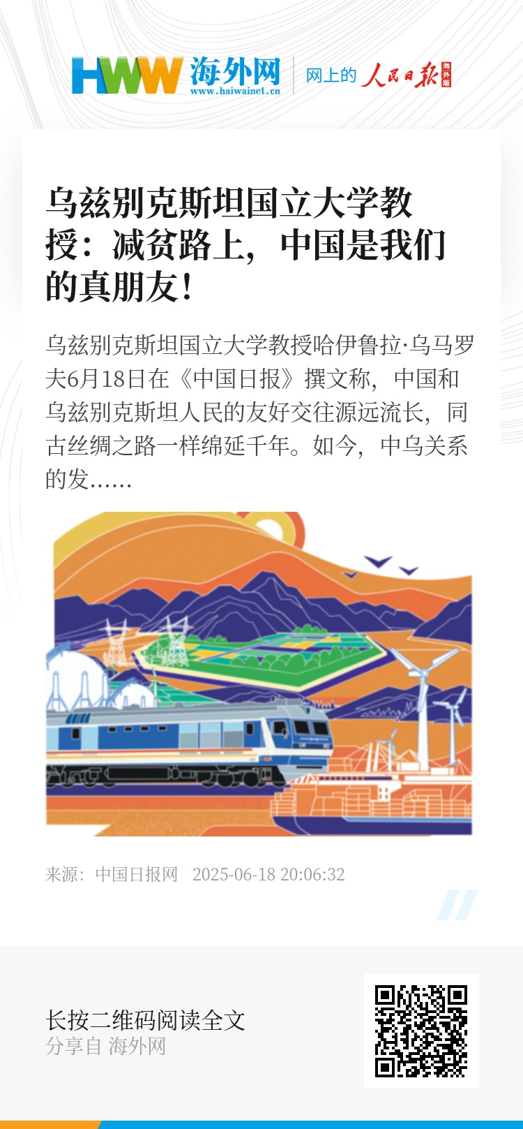 乌兹别克斯坦国立大学教授哈伊鲁拉·乌马罗夫6月18日在《中国日报》撰文称,中国和乌兹别克斯坦人民的友好交往源远流长,同古丝绸之路一样绵延千年。如今,中乌关系的发展符合时代需要,双方在促进合作以及地区和国际问题上理念相近。
