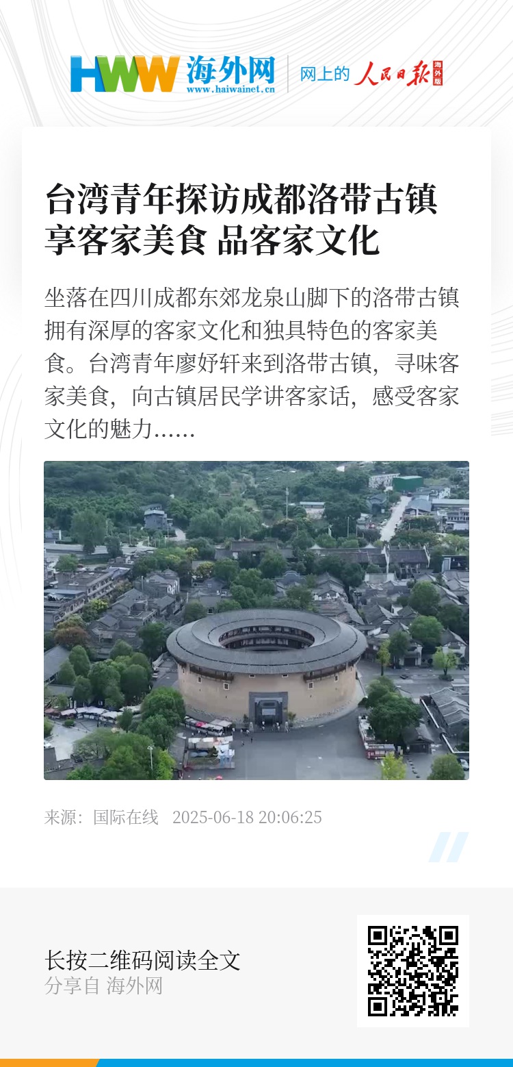 坐落在四川成都东郊龙泉山脚下的洛带古镇拥有深厚的客家文化和独具特色的客家美食。台湾青年廖妤轩来到洛带古镇,寻味客家美食,向古镇居民学讲客家话,感受客家文化的魅力。快和台湾青年一起开启洛带古镇之旅吧!