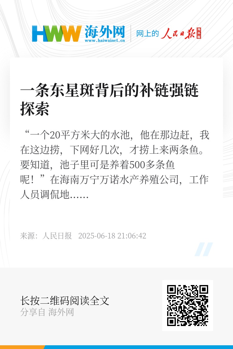 面对养殖端规模的快速增长,万宁政府部门和行业协会一方面加大东星斑的行业标准认定,通过强监管确保品质和产业安全,另一方面大力开拓市场,实现养殖规模与消费市场协同联动,进一步擦亮“中国东星斑之乡”金字招牌。(记者 周亚军)