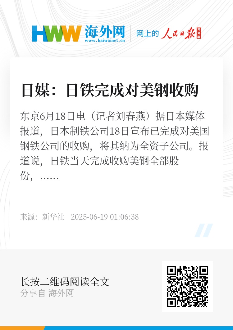 新华社东京6月18日电(记者刘春燕)据日本媒体报道,日本制铁公司18日宣布已完成对美国钢铁公司的收购,将其纳为全资子公司。