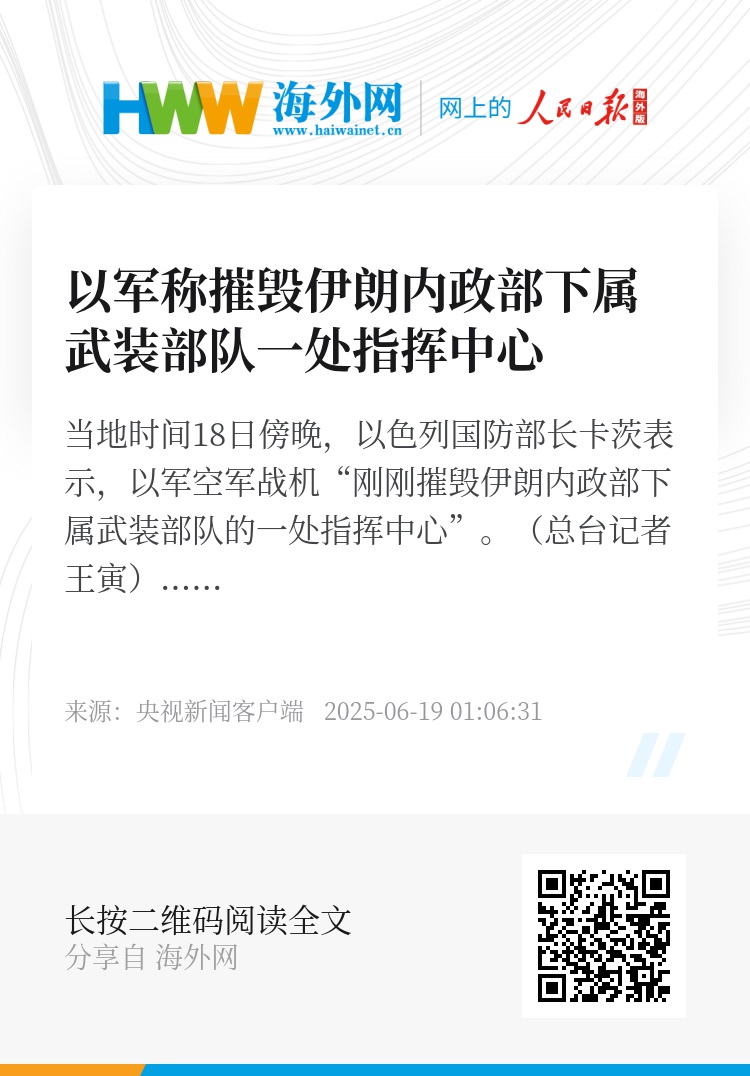 当地时间18日傍晚,以色列国防部长卡茨表示,以军空军战机“刚刚摧毁伊朗内政部下属武装部队的一处指挥中心”。(总台记者 王寅)