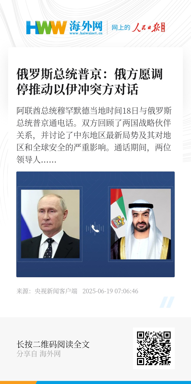 俄罗斯总统普京在与阿联酋总统穆罕默德举行的电话会谈中表示,俄罗斯准备在推动以伊冲突各方对话方面给予“调停性支持”,并已就这一意向与多国领导人进行了沟通。