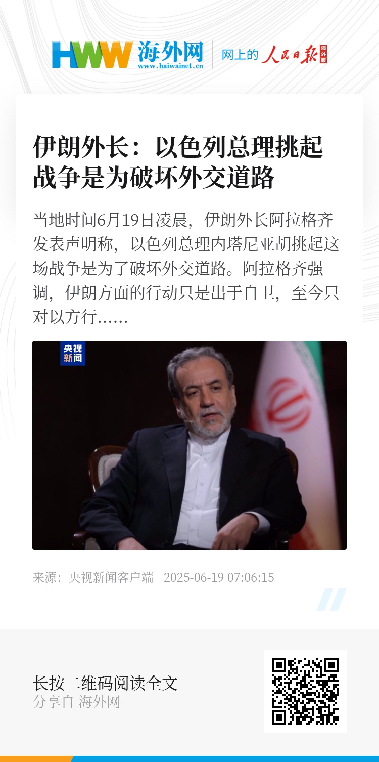 当地时间6月19日凌晨,伊朗外长阿拉格齐发表声明称,以色列总理内塔尼亚胡挑起这场战争是为了破坏外交道路。