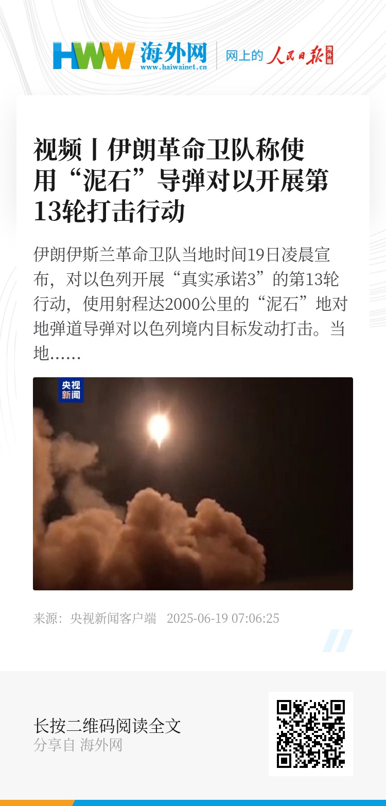 伊朗伊斯兰革命卫队当地时间19日凌晨宣布,对以色列开展“真实承诺3”的第13轮行动,使用射程达2000公里的“泥石”地对地弹道导弹对以色列境内目标发动打击。