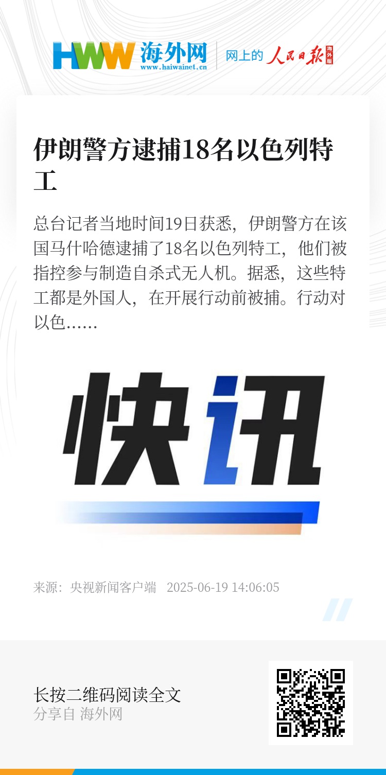 总台记者当地时间19日获悉,伊朗警方在该国马什哈德逮捕了18名以色列特工,他们被指控参与制造自杀式无人机。