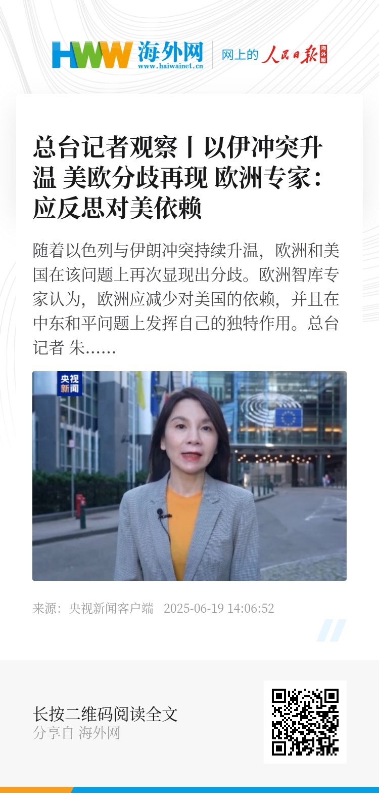 总台记者 朱曦莉:以色列和伊朗之间的大规模冲突还在持续,而这场冲突也在国际舞台上再次撕开了欧美之间的裂痕。欧洲智库专家就直言,欧洲应当反思在安全上对美国的依赖,不应该再对美国抱有幻想。