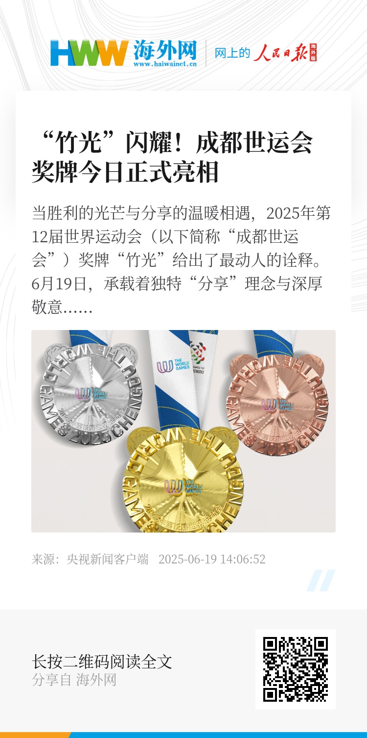 当胜利的光芒与分享的温暖相遇,2025年第12届世界运动会(以下简称“成都世运会”)奖牌“竹光”给出了最动人的诠释。6月19日,承载着独特“分享”理念与深厚敬意的赛事奖牌——“竹光”正式亮相!