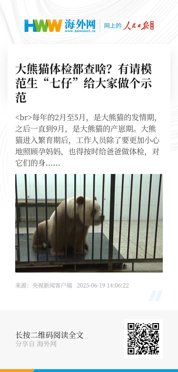 每年的2月至5月,是大熊猫的发情期,之后一直到9月,是大熊猫的产崽期。大熊猫进入繁育期后,工作人员除了要更加小心地照顾孕妈妈,也得按时给爸爸做体检,对它们的身体健康加强监测。在陕西西安的秦岭大熊猫研究中心,生活着全球唯一一只圈养的棕色大熊猫“七仔”,今年它也参与了繁育,它的身体状况如何呢?