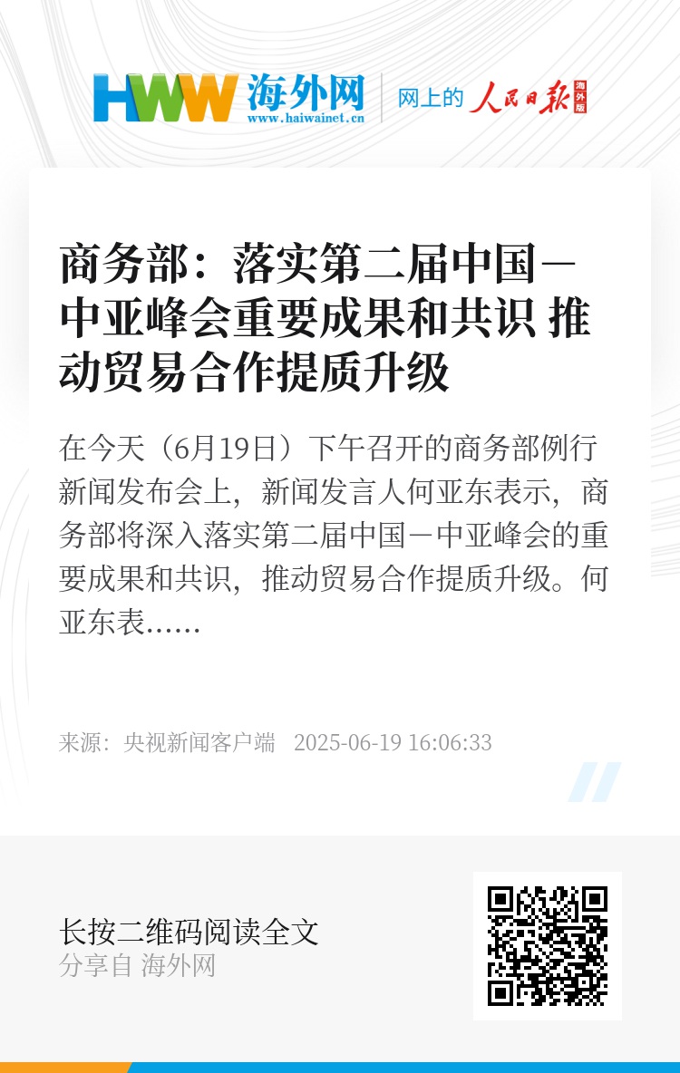 在今天(6月19日)下午召开的商务部例行新闻发布会上,新闻发言人何亚东表示,商务部将深入落实第二届中国-中亚峰会的重要成果和共识,推动贸易合作提质升级。