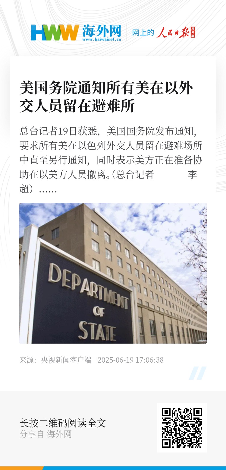 总台记者19日获悉,美国国务院发布通知,要求所有美在以色列外交人员留在避难场所中直至另行通知,同时表示美方正在准备协助在以美方人员撤离。(总台记者 李超)