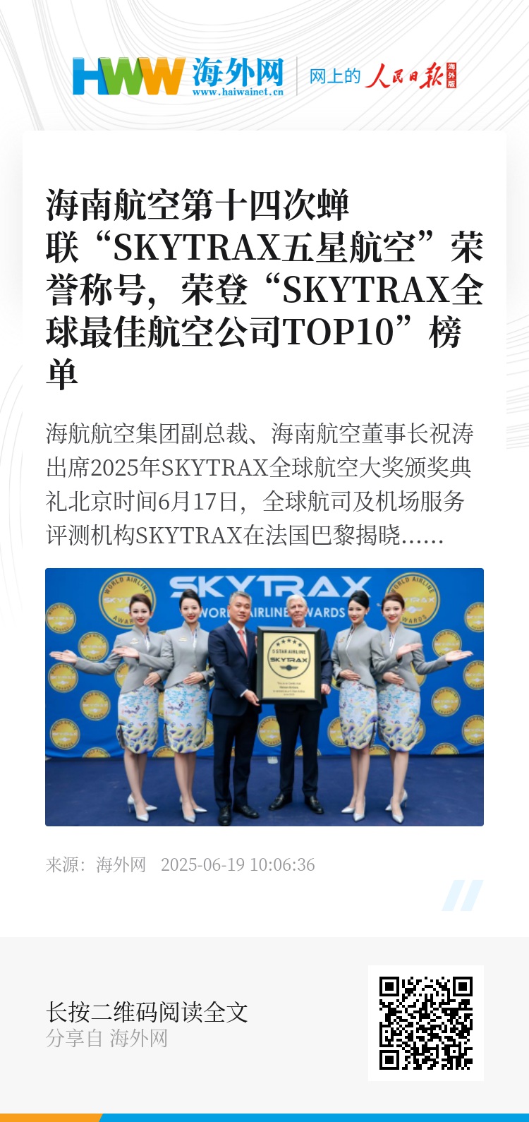 本次荣获2025年SKYTRAX全球航空大奖,是对海南航空服务的认可,更是激励新海航人不断前行的动力。未来,海南航空将遵循“经营企业一定要对国家有利、对企业有利、对员工有利、对旅客有利”的企业价值观,坚守服务初心,持续升级、创新产品,用心打磨服务细节,以五星航空的服务品质,为广大旅客提供安全、舒适、便利的航空出行体验。(谭屈玲、杨文瑞)