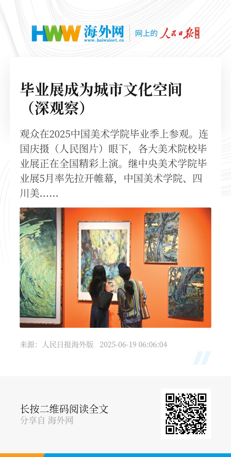 “因为毕业季,整个城市形成了一个比较独特的文化生态。就是每年到了6月,杭州市民已经习惯到我们的展区来看展。”2025中国美院毕业季总策展人刘益红说,毕业季已经成为一个多元开放、充满青春创造力的全民美育课堂。