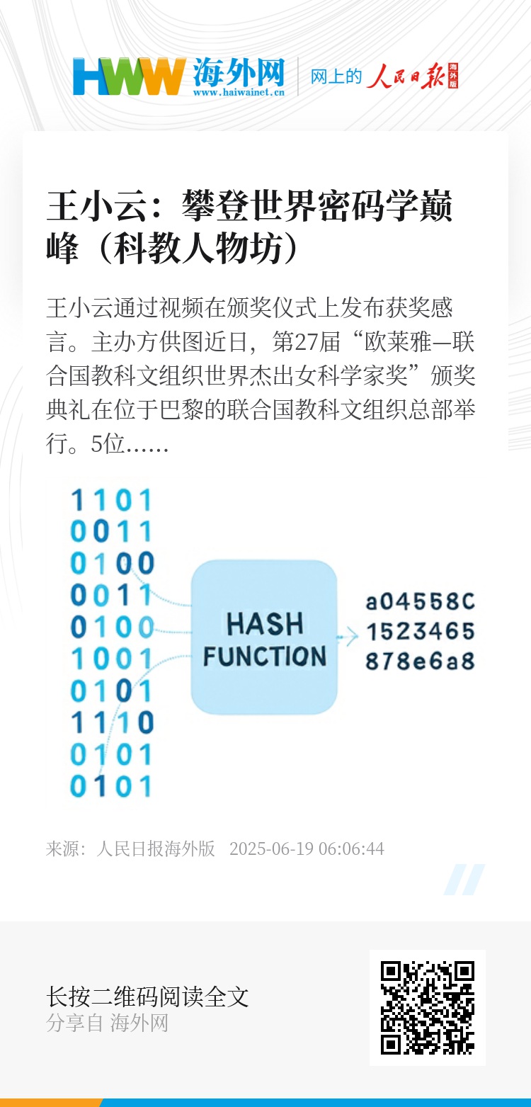 联合国教科文组织在今年评奖的新闻公报中写道,王小云在密码学及其相关数学问题领域的重大研究成果,为安全的数据通信和存储提供了坚实保障。她的突破性研究揭示了被广泛应用于通信协议的哈希函数所存在的根本性漏洞,推动了新一代哈希函数标准的制定。如今,这些标准广泛应用于银行卡、计算机密码与电子商务领域。她的变革性研究成果激励着众多女性投身数学与网络安全研究。
