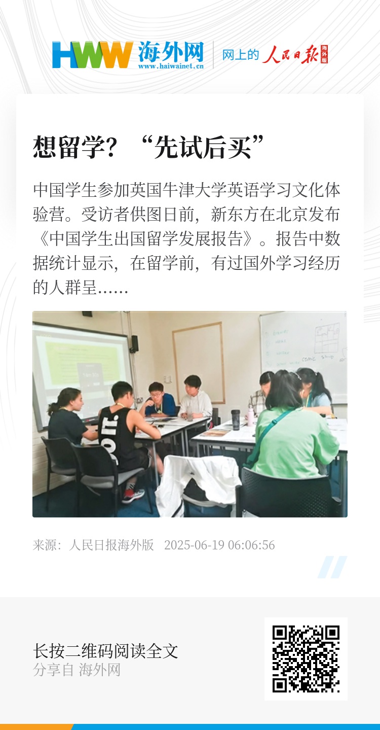 “今年暑假,我想给孩子报名一个研学项目,提前感受一下国外校园生活。”广东家长陈玉女士说,“家长可以借短期海外项目引导孩子主动学习,说不定哪次经历就会对孩子影响深远”。