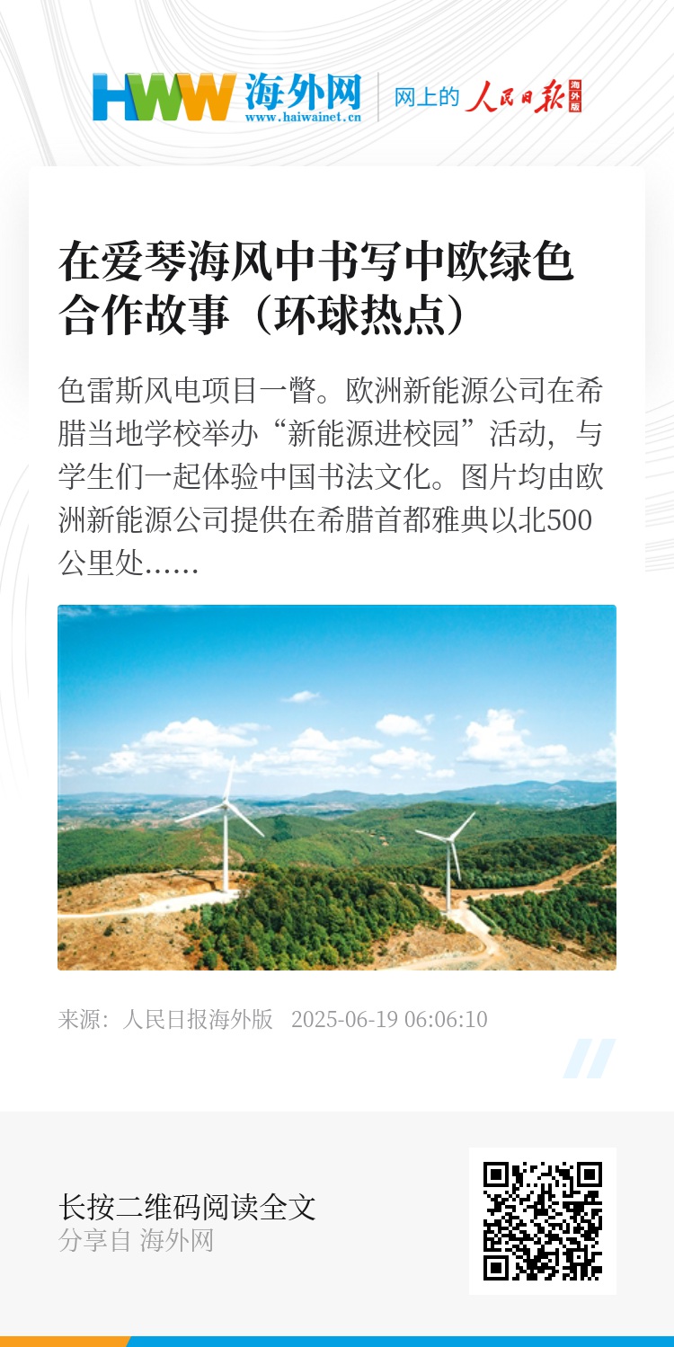 希腊青年艾莱妮曾在“Z世代(中欧)能源行”希腊专场活动中扮演“一日巡检员”,沉浸式体验风电场的日常工作。“我对中国企业在希腊推动可再生能源发展所做的努力感到由衷敬佩!”艾莱妮说,希望更多人践行绿色发展理念,为美丽的地球家园创造一个更加清洁、绿色的未来。(本报记者 李嘉宝)