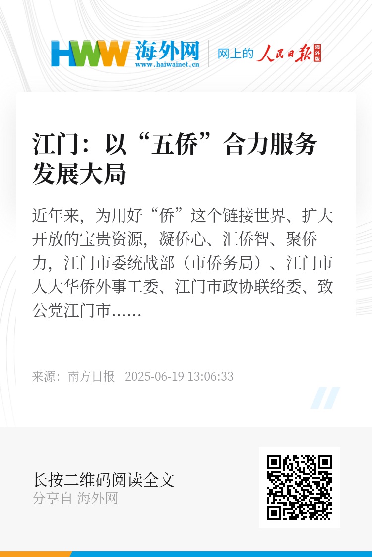 近年来,为用好“侨”这个链接世界、扩大开放的宝贵资源,凝侨心、汇侨智、聚侨力,江门市委统战部(市侨务局)、江门市人大华侨外事工委、江门市政协联络委、致公党江门市委会、江门市侨联等“五侨”部门在江门市委的坚强领导下,联手协同开展工作,精心打造“同心·聚力”侨务工作品牌,集中有限的力量办大事、干实事,切实将“侨”的优势转化为江门高质量发展的胜势。