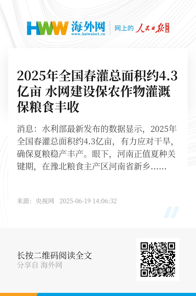 央视网消息:水利部最新发布的数据显示,2025年全国春灌总面积约4.3亿亩,有力应对干旱,确保夏粮稳产丰产。