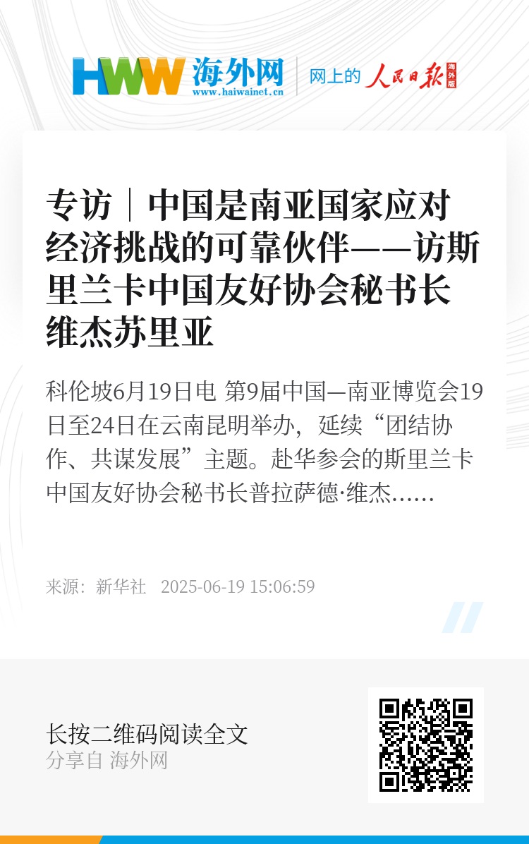 新华社科伦坡6月19日电 第9届中国—南亚博览会19日至24日在云南昆明举办,延续“团结协作、共谋发展”主题。赴华参会的斯里兰卡中国友好协会秘书长普拉萨德·维杰苏里亚在行前接受新华社记者专访时说,当前全球经济面临诸多挑战,中国坚定不移推进高水平对外开放、扩大优质商品和服务进口,是斯里兰卡等南亚国家应对经济挑战的可靠伙伴。
