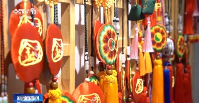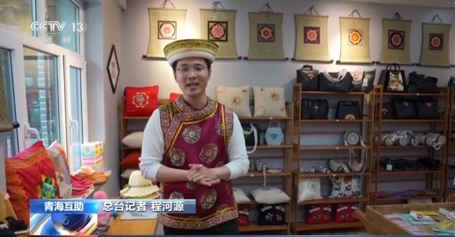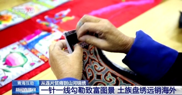 总台记者 程河源:在互助土族自治县班彦村的盘绣园内,我穿的就是土族青年的日常穿搭。一针穿越千年,一线联结世界。土族盘绣是国家级非遗项目,也是过去,村民们给出嫁的女儿做嫁妆的一种手艺。从2017年开始,班彦村抓住这一机会,把土族盘绣打造成乡村致富产业,建起了盘绣园,组起绣娘队伍,让盘绣从过去的嫁妆,变成现在的香包,电脑包,手提包等等琳琅满目的盘绣工艺品,结合现代需求的同时,将盘绣融入了我们的日常生活。据统计,这里的盘绣产品已销往全国二十多个省区市,有的甚至远销海外。