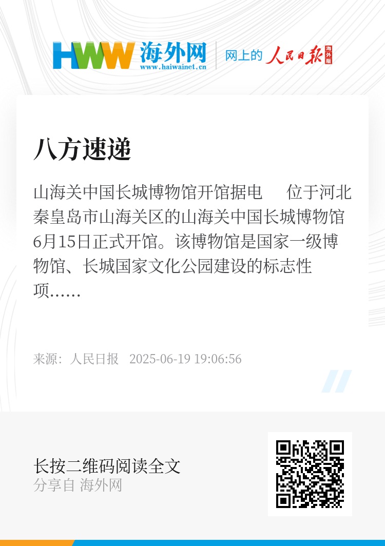 据新华社电 位于河北秦皇岛市山海关区的山海关中国长城博物馆6月15日正式开馆。该博物馆是国家一级博物馆、长城国家文化公园建设的标志性项目。