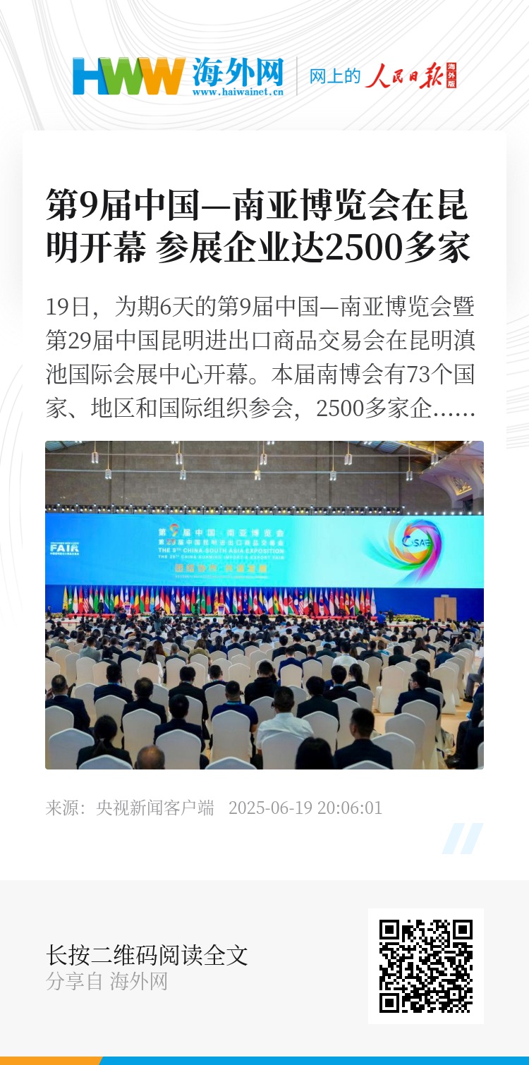 19日,为期6天的第9届中国—南亚博览会暨第29届中国昆明进出口商品交易会在昆明滇池国际会展中心开幕。本届南博会有73个国家、地区和国际组织参会,2500多家企业参展,覆盖了南亚、东南亚所有国家。