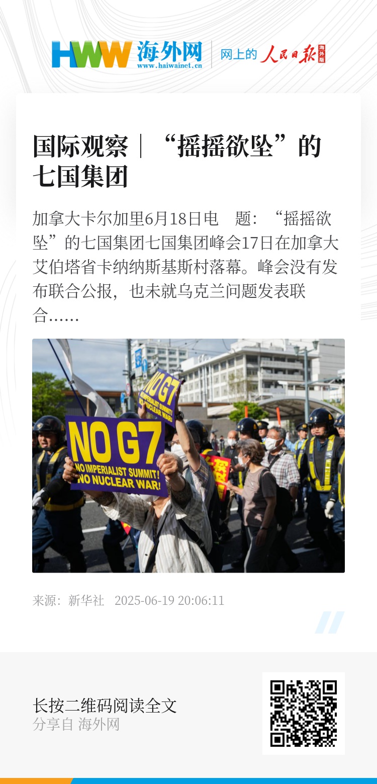 分析人士指出,本届峰会显示,在关税、乌克兰问题、以伊冲突等重大问题上,七国集团内部尤其是美国与其他国家之间的立场明显不同,早已“心不和”的七国领导人甚至不愿意维持“面和”。随着美国继续强化“美国优先”政策,七国集团内部嫌隙加剧,影响力持续走低。