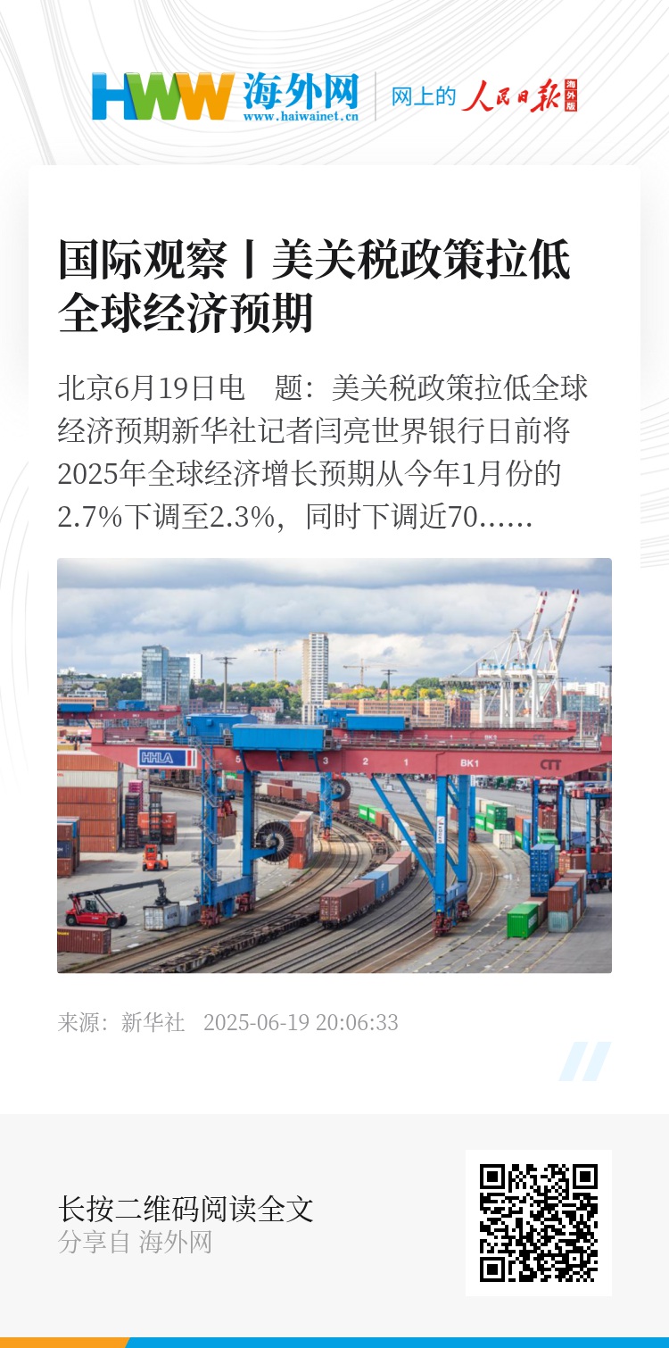 新华社北京6月19日电 题:美关税政策拉低全球经济预期