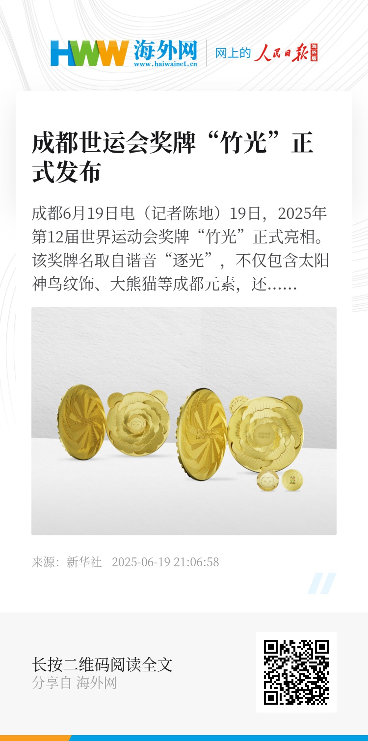 新华社成都6月19日电(记者陈地)19日,2025年第12届世界运动会奖牌“竹光”正式亮相。该奖牌名取自谐音“逐光”,不仅包含太阳神鸟纹饰、大熊猫等成都元素,还贴心地设计成“开口”的样式,运动员可将奖牌中的徽章赠予他人,承载着独特的“分享”理念。