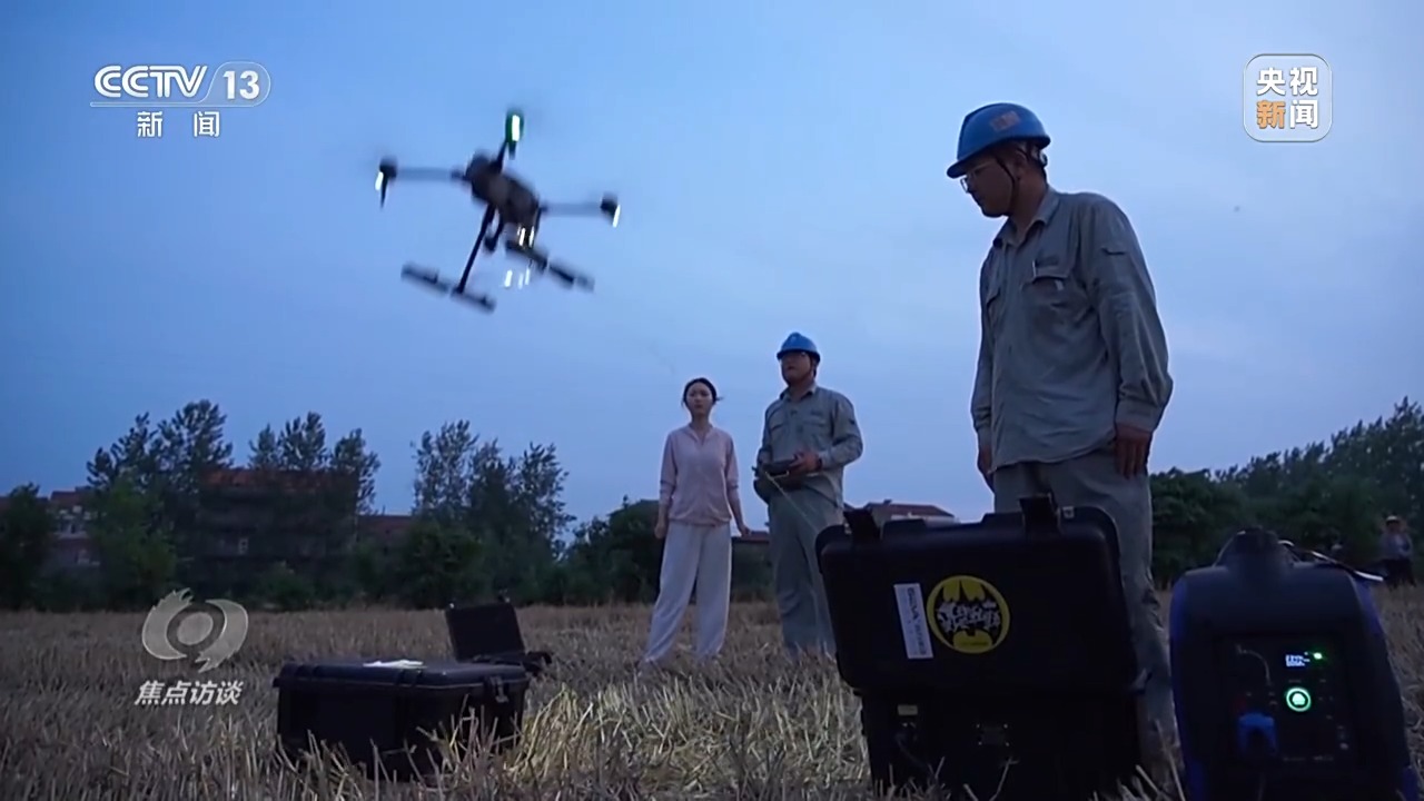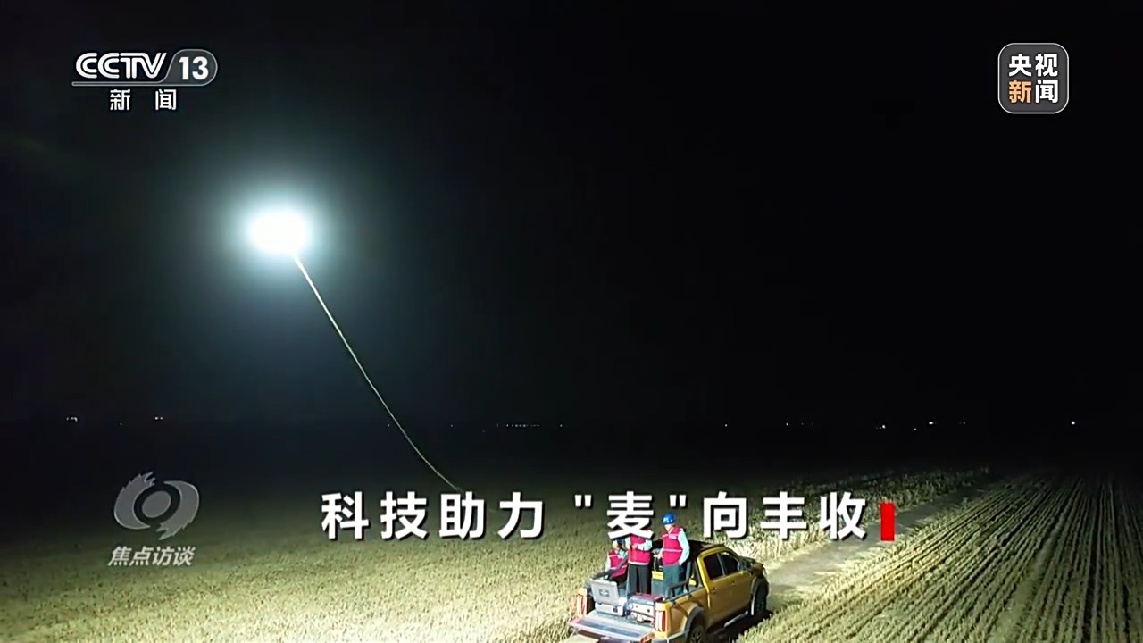 像放风筝一样,一个人从供电机牵线,另一个人控制无人机飞行,两人打好配合,灯随着车走。经过五次磨合试飞,600瓦的灯光终于刺破夜空,照亮了两亩麦田的区域。供电所技术人员的驻守,让吴从先家的小麦在暴雨来临前全部入仓。
