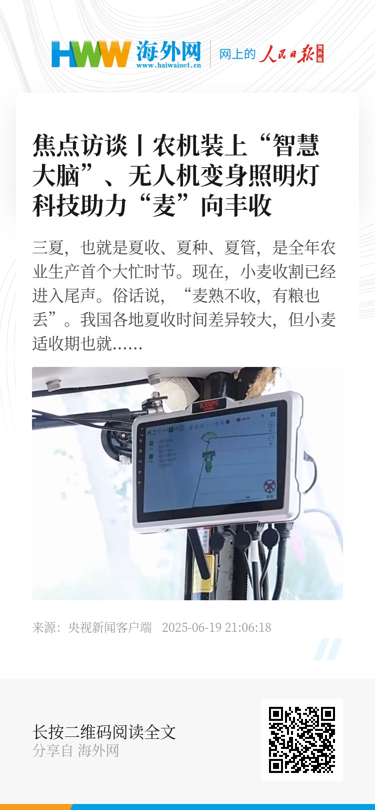用科技点亮了麦田,也点亮了农民的希望,更让我们看到了科技赋能现代农业的无限可能。像安装了智能辅助驾驶仪的收割机,像在紧急时刻点亮麦收现场的无人机,还有其他一些科技装备的应用,都说明“科技”早已不再是实验室里冰冷的数据,它正扎扎实实地扎根于泥土,转化为守护丰收的生产力。农业现代化,关键是农业科技现代化。在希望的田野上,“藏粮于地、藏粮于技”,正让大国粮仓的根基更加稳固。