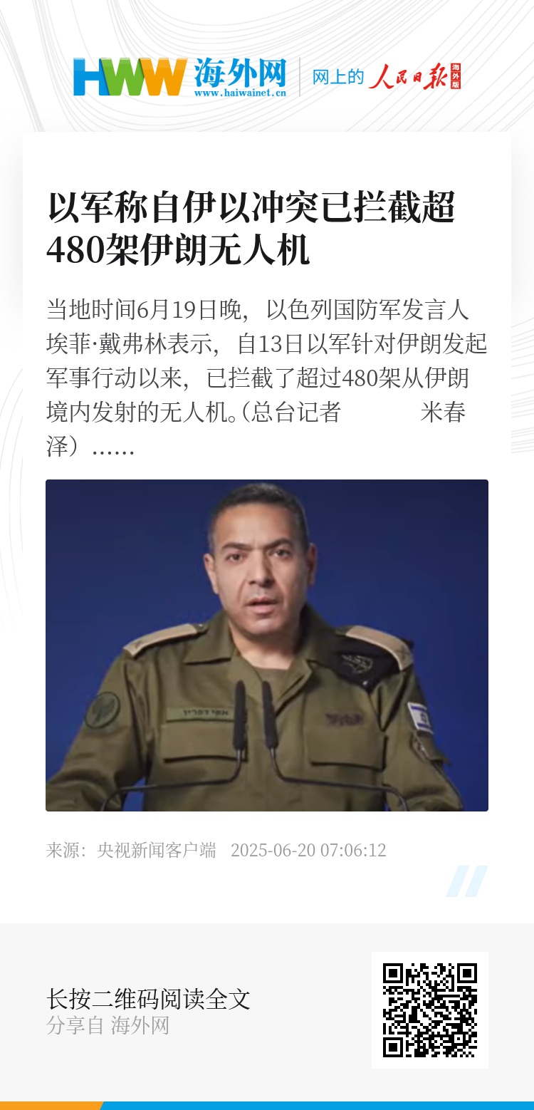 当地时间6月19日晚,以色列国防军发言人埃菲·戴弗林表示,自13日以军针对伊朗发起军事行动以来,已拦截了超过480架从伊朗境内发射的无人机。(总台记者 米春泽)
