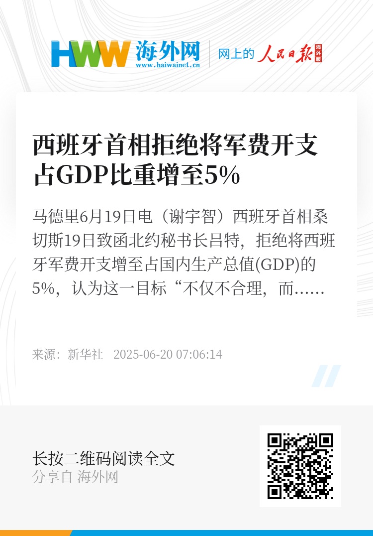 新华社马德里6月19日电(谢宇智)西班牙首相桑切斯19日致函北约秘书长吕特,拒绝将西班牙军费开支增至占国内生产总值(GDP)的5%,认为这一目标“不仅不合理,而且会适得其反”。