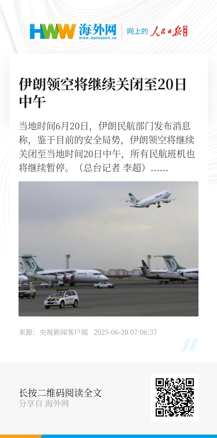 当地时间6月20日,伊朗民航部门发布消息称,鉴于目前的安全局势,伊朗领空将继续关闭至当地时间20日中午,所有民航班机也将继续暂停。(总台记者 李超)