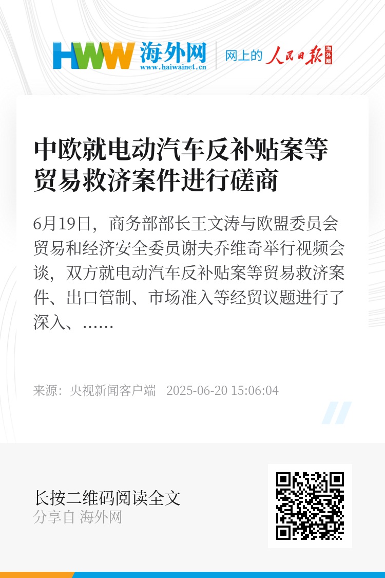 6月19日,商务部部长王文涛与欧盟委员会贸易和经济安全委员谢夫乔维奇举行视频会谈,双方就电动汽车反补贴案等贸易救济案件、出口管制、市场准入等经贸议题进行了深入、专业的磋商。