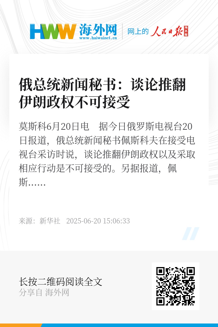 新华社莫斯科6月20日电 据今日俄罗斯电视台20日报道,俄总统新闻秘书佩斯科夫在接受电视台采访时说,谈论推翻伊朗政权以及采取相应行动是不可接受的。