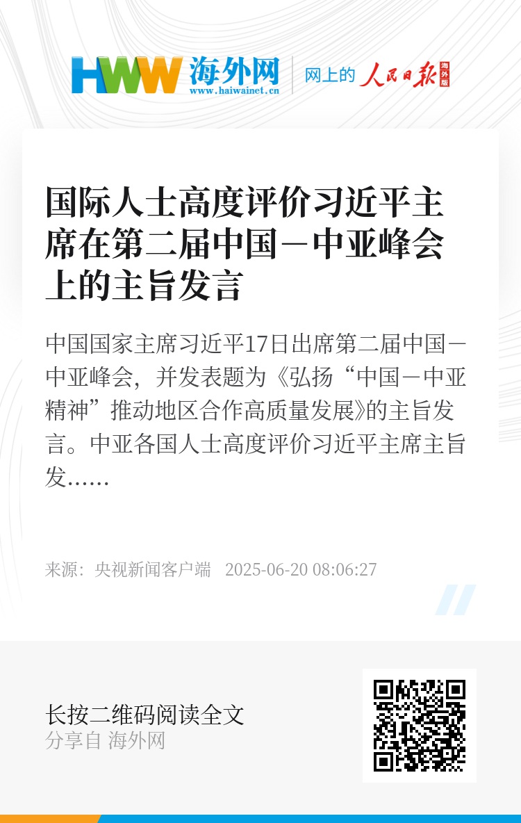 国际人士表示,第二届中国-中亚峰会取得的丰硕成果向国际社会展现了中国与中亚国家的深度合作的新前景,习主席提出的重要理念为世界繁荣稳定注入强劲动能。