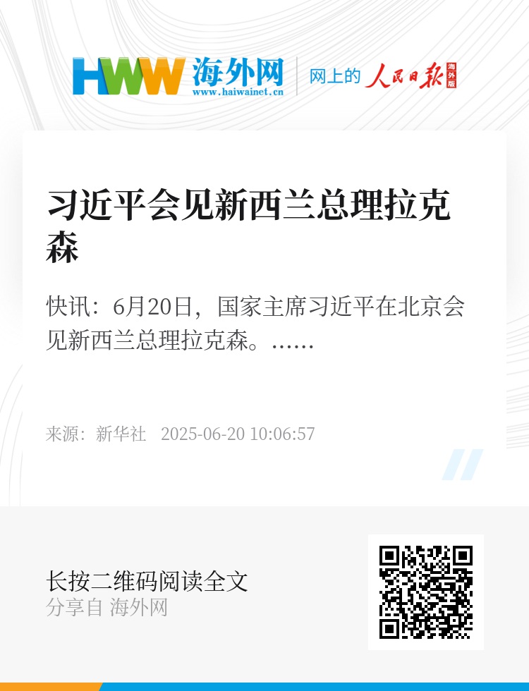 新华社快讯:6月20日,国家主席习近平在北京会见新西兰总理拉克森。