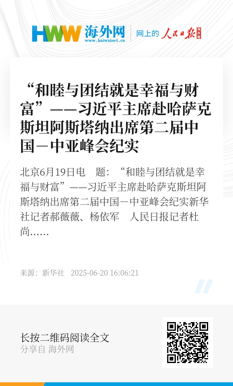 新华社北京6月19日电 题:“和睦与团结就是幸福与财富”——习近平主席赴哈萨克斯坦阿斯塔纳出席第二届中国-中亚峰会纪实
