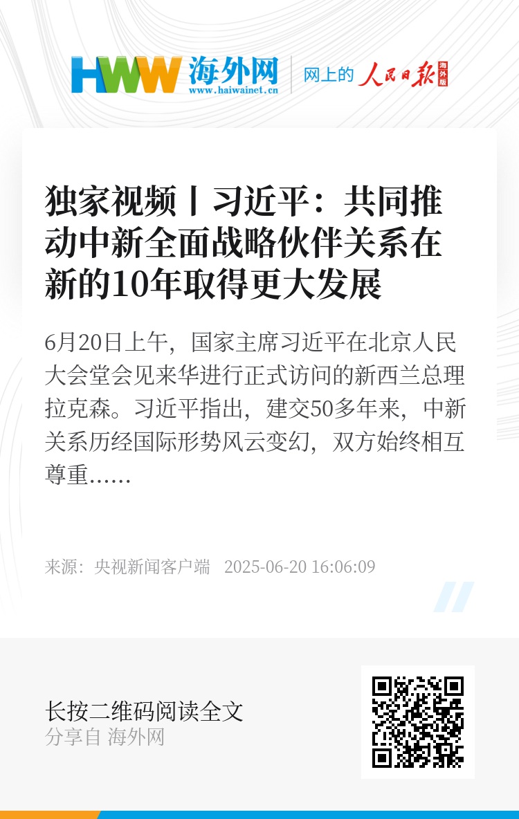 6月20日上午,国家主席习近平在北京人民大会堂会见来华进行正式访问的新西兰总理拉克森。