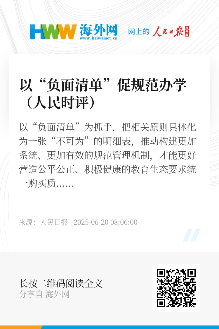 比如,有的地方建立“校长负责制+家长监督委员会+第三方评估”的监管体系,实现对办学行为的常态化、全过程监督;多地试点智慧校园管理系统,通过大数据实时监测课程开设、作业布置情况。以“负面清单”为抓手,把相关原则具体化为一张“不可为”的明细表,推动构建更加系统、更加有效的规范管理机制,才能更好营造公平公正、积极健康的教育生态。