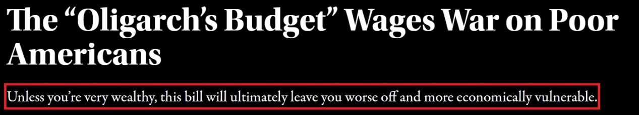 文章称,这份“寡头预算”是向美国穷人发动的无情战争,对低收入美国人利益的侵犯几乎是史无前例的。“除非你非常富有,否则这项法案最终会让你的境况更糟,在经济上更脆弱。”