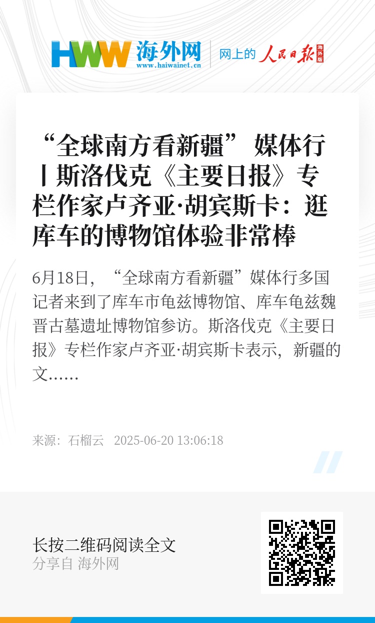 6月18日,“全球南方看新疆”媒体行多国记者来到了库车市龟兹博物馆、库车龟兹魏晋古墓遗址博物馆参访。斯洛伐克《主要日报》专栏作家卢齐亚·胡宾斯卡表示,新疆的文物保护工作非常完善,在这里的观展体验非常棒。