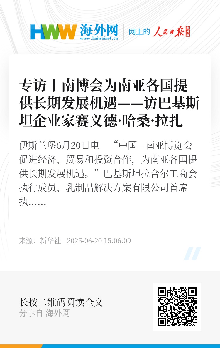 新华社伊斯兰堡6月20日电 “中国—南亚博览会促进经济、贸易和投资合作,为南亚各国提供长期发展机遇。”巴基斯坦拉合尔工商会执行成员、乳制品解决方案有限公司首席执行官赛义德·哈桑·拉扎日前接受新华社记者书面专访时说。