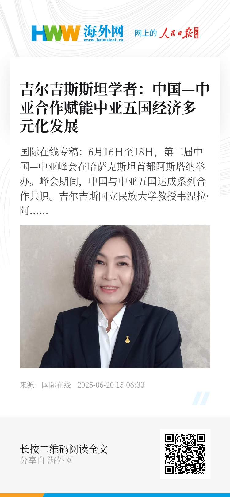 国际在线专稿:6月16日至18日,第二届中国—中亚峰会在哈萨克斯坦首都阿斯塔纳举办。峰会期间,中国与中亚五国达成系列合作共识。吉尔吉斯国立民族大学教授韦涅拉·阿克玛托娃在接受国际在线记者专访时表示,中国与中亚国家交往历史悠久,情谊源远流长。中国同中亚国家深化互利合作将为中亚五国带来经济多元化发展机遇。
